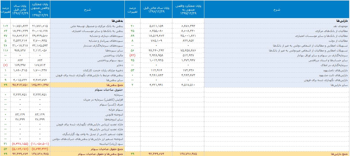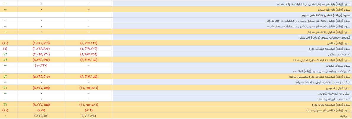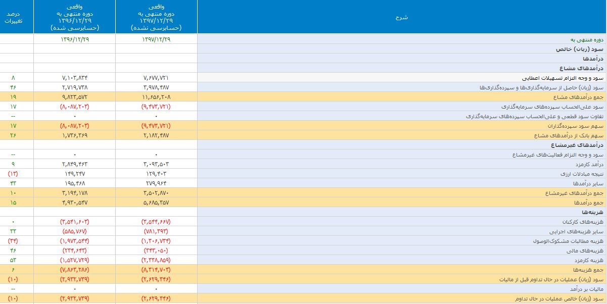 این شرکت براساس عملکرد ۱۲ ماهه برای سال مالی منتهی به ۲۹ اسفند ماه ۹۷ مبلغ (۲,۶۲۹) میلیارد ریال زیان خالص محقق کرده است.