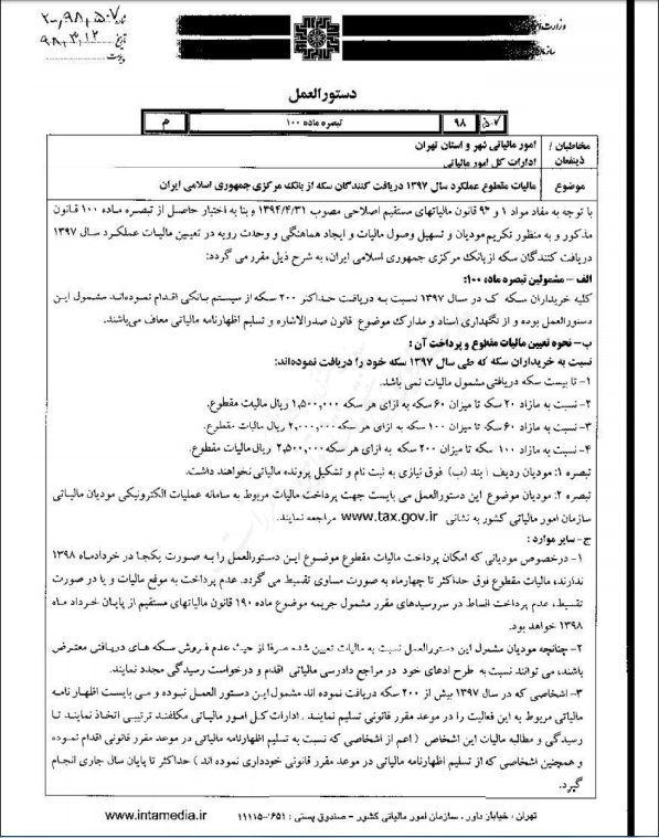 سازمان امور مالیاتی مالیات مقطوع عملکرد سال ۹۷ دریافت‌کنندگان سکه از بانک مرکزی را ابلاغ کرد.