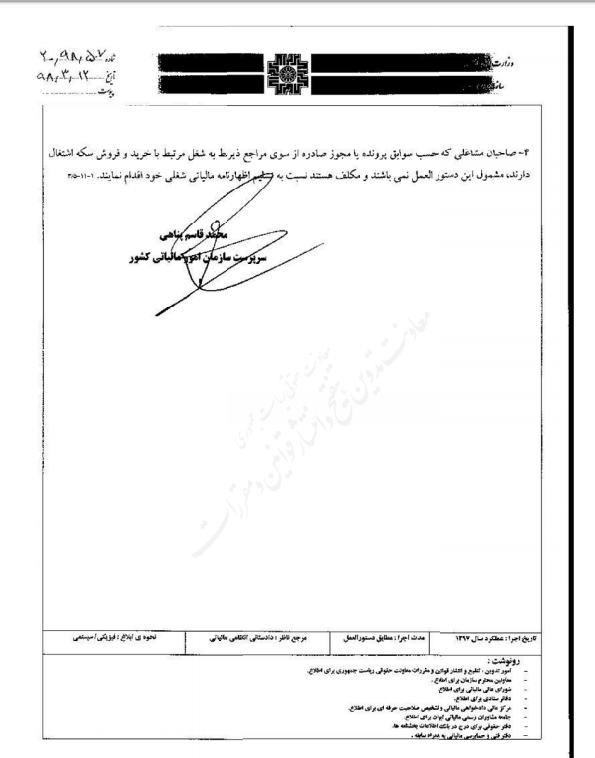 ۴. صاحبان مشاغلی که حسب سوابق پرونده یا مجوز صادره از سوی مراجع ذیربط به شغل مرتبط با خرید و فروش سکه اشتغال دارند مشمول این دستورالعمل نمی‌باشند و مکلف هستند نسبت به تنظیم اظهارنامه مالیاتی شغلی خود اقدام نمایند.