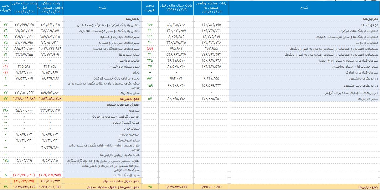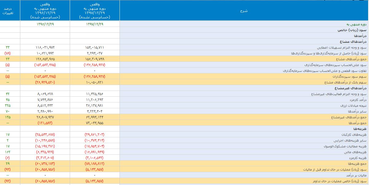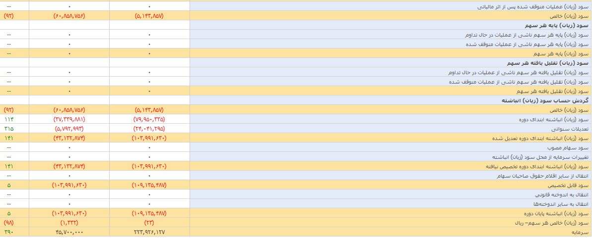 در ادامه این شفاف سازی مالی آمده است که این شرکت براساس عملکرد ۱۲ ماهه برای سال مالی منتهی به ۲۹ اسفند ۹۷ مبلغ (۵.۱۴۴) میلیارد ریال زیان خالص محقق کرده است.