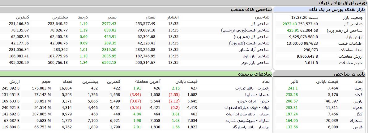 بر اساس آمارهای معاملاتی، روز جاری همه شاخصهای بورس با رشد مواجه شدند به طوری که شاخص کل با ۲۹۷۲ واحد رشد معادل ۱.۱۹ درصد به ۲۵۳ هزار و ۵۷۷ واحد، شاخص قیمت «وزنی - ارزشی» با ۸۳۰ واحد افزایش معادل ۱.۱۹ درصد به ۷۰ هزار و ۸۰۹ واحد، شاخص کل «هم وزن» با ۴۲۵ واحد افت معادل ۰.۶۹ درصد به ۶۲ هزار و ۳۰۴ واحد، شاخص قیمت «هم وزن» با ۲۸۹ واحد رشد، معادل ۰.۶۹ درصد به ۴۲ هزار و ۳۲۸ واحد، شاخص آزاد شناور با ۲۸۱۹ واحد رشد، معادل ۱.۰۱ درصد به ۲۸۳ هزار و ۲۲۶ واحد، شاخص بازار اول با ۲۰۳۵ واحد افزایش معادل ۱.۱۰ درصد به ۱۸۷ هزار ۷۴۶ واحد و شاخص بازار دوم با ۶۵۹۲ واحد صعود معادل ۱.۳۴ درصد، به ۵۰۰ هزار و ۳۱۴ واحد رسید.
