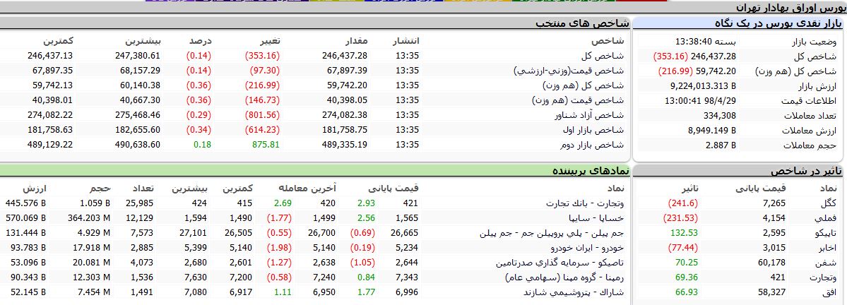 معاملات تالار شیشه‌ای روز جاری با ریزش بیش از ۳۵۰ واحدی شاخص کل بورس و رسیدن این متغیر به ۲۴۶ هزار و ۴۳۷ واحد به پایان رسید.