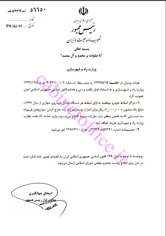 به گزارش ایبِنا، در جلسه مورخ ۱۵ مرداد ۱۳۹۹ هیات وزیران، دولت با افزایش خودروهای فرسوده موافقت کرد. این تصمیم با توجه به لزوم بروز رسانی مقررات حاکم و ناظر بر اجرای فرآیندهای نوسازی ناوگان حمل و نقل فرسوده برای اجرا و توسعه طرح از رده خارج کردن خودروهای فرسوده اتخاذ شد و به موجب آن، هزینه اسقاط خودروهای مذکور از ۵۵۰ هزار ریال به یک میلیون ریال افزایش یافت.