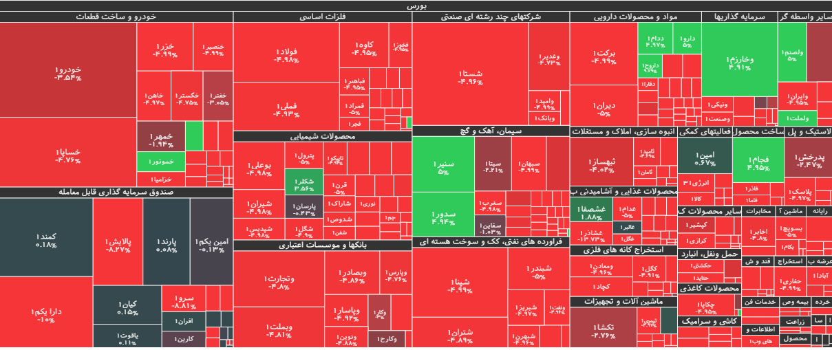 در بازار امروز، بیشترین افزایش قیمت متعلق به نماد خموتور(موتورسازانتراکتورسازیایران) با ۵ درصد رشد بود و پس از آن، نمادهای دارو، ولصنم، فجام، وخارزم و ددام بود. همچنین نماد معاملاتی غشاذر(پگاهآذربایجانغربی) با ۱۱.۹۵ درصد، بیشترین کاهش قیمت را داشت و پس از آن نیز، نمادهای وآذر، کپارس، ثاباد، غچین، نوری و پارس بود.