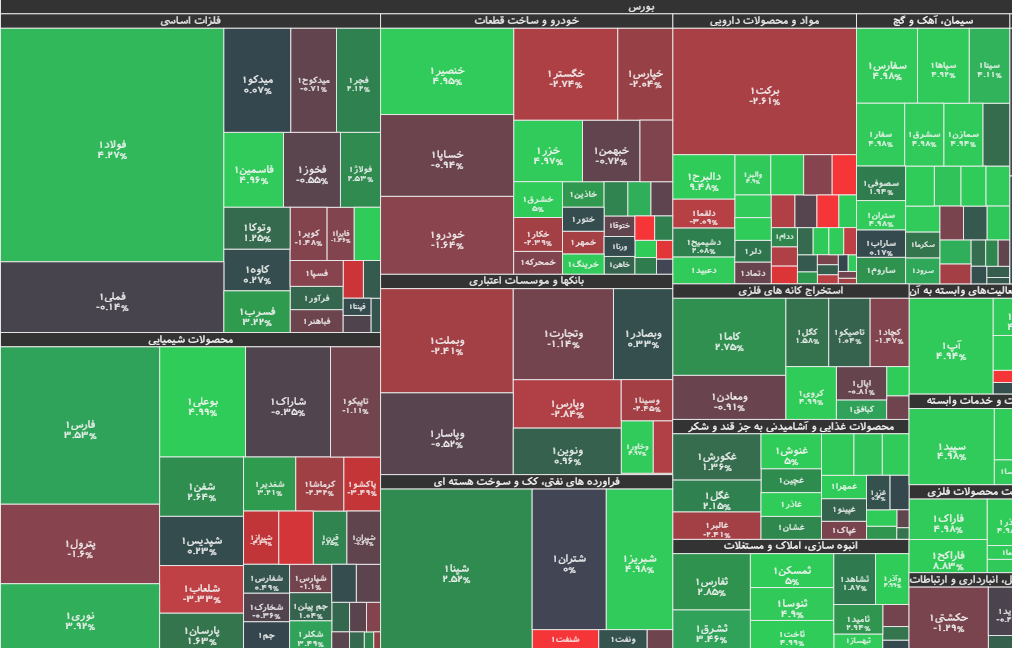 در بازار امروز، بیشترین افزایش قیمت متعلق به نماد کدما(معدنی دماوند) با ۵ درصد رشد و پس از آن، نمادهای خلنت، کالا، وسهرمز و ثبهساز بود. همچنین نماد معاملاتی دفارا(داروسازی فارابی ) با ۴.۹ درصد، بیشترین کاهش قیمت را داشت و پس از آن نیز، نمادهای خپویش، شسینا، شلعاب، کاذر و وایران قرار گرفتند.