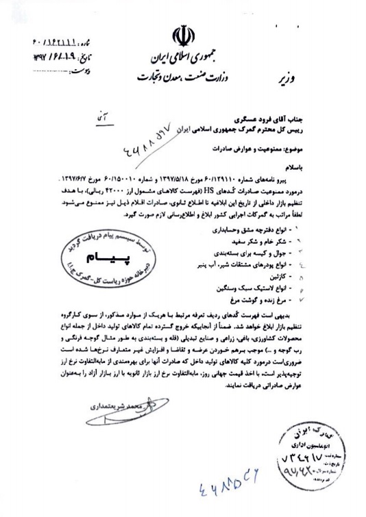 محمد شریعتمداری وزیر صنعت روز ۱۹ شهریور ماه در نامه ای به رییس کل گمرک خواستار ممنوعیت صادرات این هفت قلم کالا شده بود.