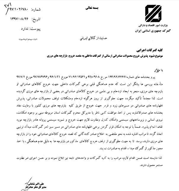 گمرک ایران شیوه پذیرش محموله‌های صادراتی از گمرکات داخلی و خروج از بازارچه‌های مرزی را ابلاغ کرد.