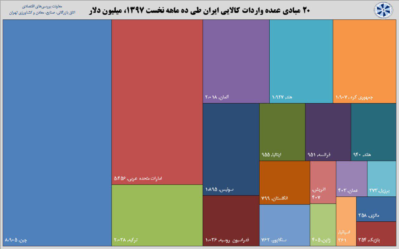 به گزارش خبرنگار ایبِنا، معاونت بررسی های اقتصادی اتاق بازرگانی تهران ۲۰ کشور اول صادرکننده کالا به ایران را طی ۱۰ ماهه نخست سال ۹۷ معرفی کرده که براساس آن کشور چین با صادرات ۸ میلیارد و ۹۰۵ میلیون دلار اولین صادرکننده به ایران بوده است.