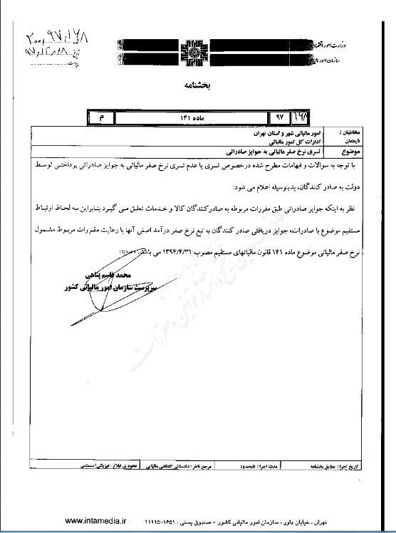 به گزارش ایبِنا، بخشنامه سازمان امور مالیاتی با موضوع تسری نرخ صفر مالیاتی به جوایز صادراتی، طی نامه شماره ۲۰۰/۹۷/۱۶۸ در تاریخ ۹۷.۱۲.۱۸ توسط سرپرست سازمان امور مالیاتی کشور ابلاغ شد.