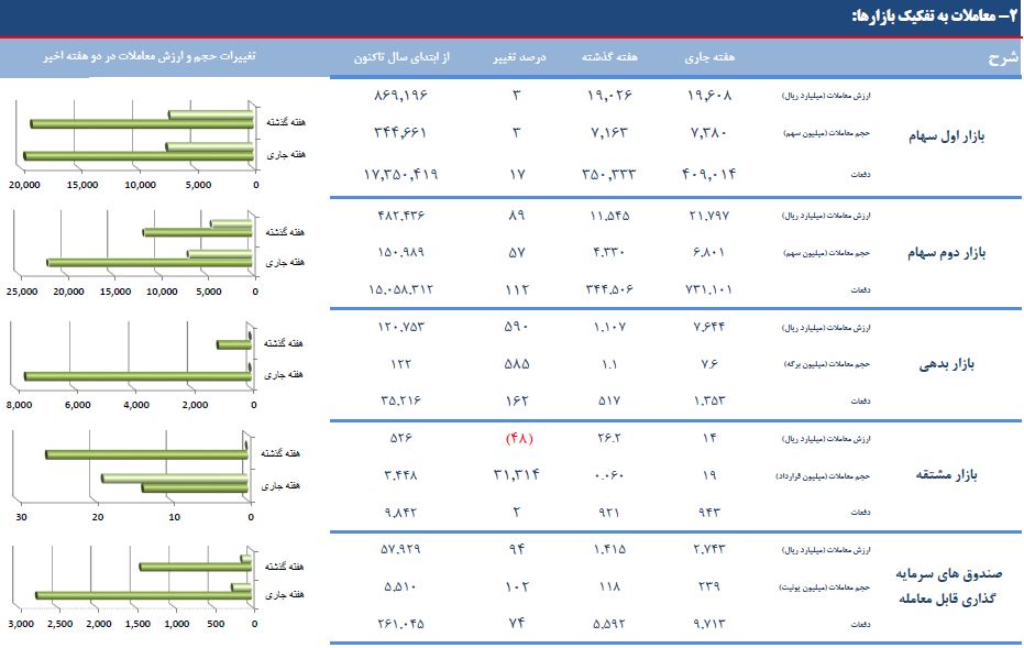 این درحالی است که  تعداد ۲۳۹ میلیون واحد از صندوق های سرمایه گذاری قابل معامله در بورس تهران به ارزش کل بیش از ۲.۷۴۳ میلیارد ریال مورد معامله  قرار گرفت و به ترتیب با ۱۰۲ درصد و ۹۴ درصد افزایش نسبت به هفته گذشته همراه شدند. از سویی دیگر در بازار بدهی ۷ میلیون ۶۰۰ هزار برگه به ارزش ۷۶۴۴ میلیارد ریال مورد داد و ستد قرار گرفت.