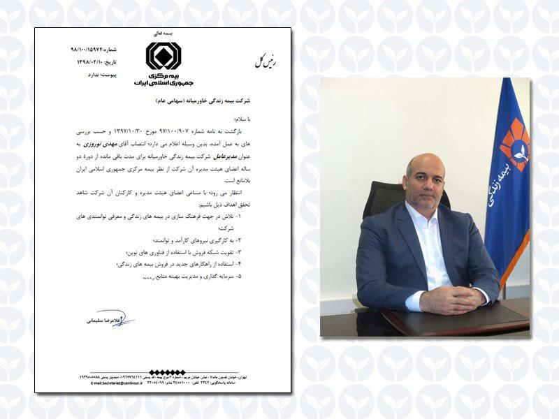 در نامه رییس کل بیمه مرکزی آمده است: انتصاب مهدی نوروزی به عنوان مدیرعامل شرکت بیمه زندگی خاورمیانه برای مدت باقی مانده از دوره ۲ ساله اعضای هیات مدیره آن شرکت از نظر بیمه مرکزی بلامانع است.