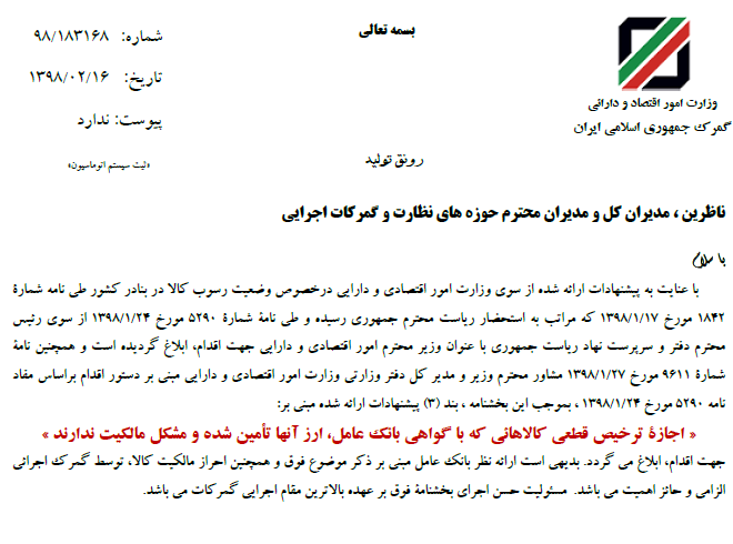 به گزارش ایبِنا در بخشنامه گمرک آمده است: با عنایت به پیشنهادات ارایه شده از سوی وزارت امور اقتصادی و دارایی در خصوص وضعیت رسوب کالا در بنادر کشور طی نامه شماره ۱۸۴۲ مورخ ۱۳۹۸.۱.۱۷ که مراتب به استحضار ریاست محترم جمهور رسیده و طی نامه شماره ۵۲۹۰ مورخ ۱۳۹۸.۱.۳۴ از سوی رییس محترم دفتر و سرپرست نهاد ریاست جمهوری با عنوان وزیر محترم امور اقتصادی و دارایی جهت اقدام، ابلاغ گردیده است و همچنین نامه شماره ۹۶۱۱ مورخ ۱۳۹۸.۱.۲۷ مشاور محترم وزیر و مدیر کل دفتر وزارتی وزارت امور اقتصادی و دارایی مبنی بر دستور اقدام بر اساس مفاد نامه ۵۲۹۰ مورخ ۱۳۹۸.۱.۲۴، به موجب این بخشنامه بند ۳ پیشنهادات ارایه شده مبنی بر : «اجازه ترخیص قطعی کالاهایی که با گواهی بانک عامل، ارز آنها تامین شده و مشکل مالکیت ندارند» جهت اقدام ابلاغ میگردد.