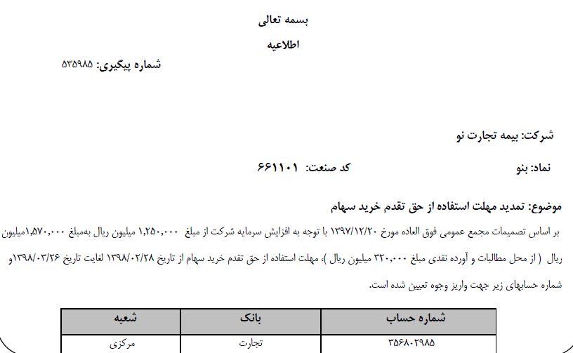 مهلت استفاده از حق تقدم خرید سهام شرکت بیمه تجارت نو تمدید شد.