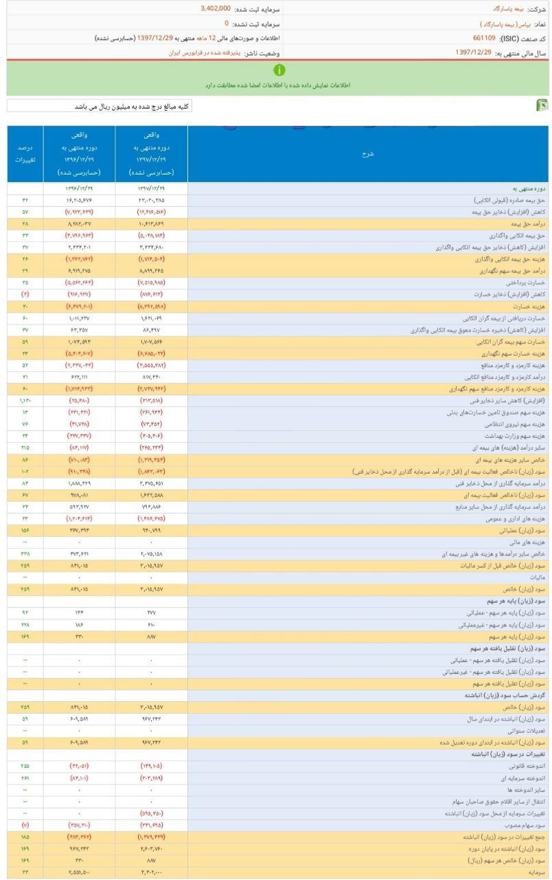 این شرکت براساس عملکرد ۱۲ ماهه برای سال مالی منتهی به ۲۹ اسفندماه مبلغ ۳.۰۱۵.۹۵۷ میلیون ریال سود خالص محقق کرده است. بر اساس اطلاعیه کدال، بیمه پاسارگاد در دوره مورد اشاره، ۲۳.۰۳۰.۳۸۵ میلیون ریال حق بیمه صادره داشته که نسبت به سال قبل از آن ۴۲ درصد رشد داشته است. درآمد حق بیمه این شرکت نیز تا پایان سال ۹۷، معادل ۱۰.۶۱۳.۸۶۹ میلیون ریال بوده که نسبت به سال قبل از آن ۲۸ درصد افزایش نشان می دهد.