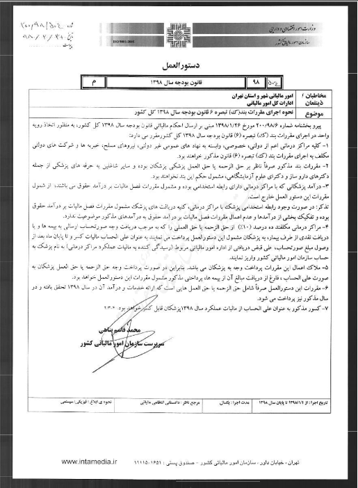 ۷. کسور مذکور به عنوان علی الحساب از مالیات عملکرد سال ۱۳۹۸ پزشکان قابل کسر خواهد بود.