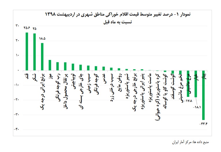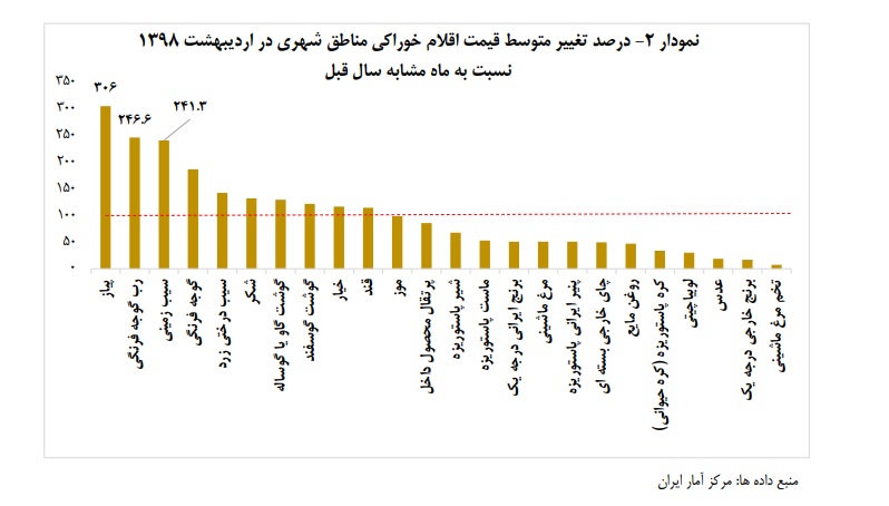 با این حال در اردیبهشت ماه ۹۸، از ۲۴ قلم کالای خوراکی، متوسط قیمت ۱۰ قلم کالا نسبت به اردیبهشت ماه ۱۳۹۷ بیش از دو تا چهار برابر شده است. در میان این کالاها، پیاز بالاترین رشد نقطه به نقطه قیمت را داشته به طوری که متوسط قیمت این محصول نسبت به اردیبهشت ماه سال قبل بیش از چهار برابر شده است.