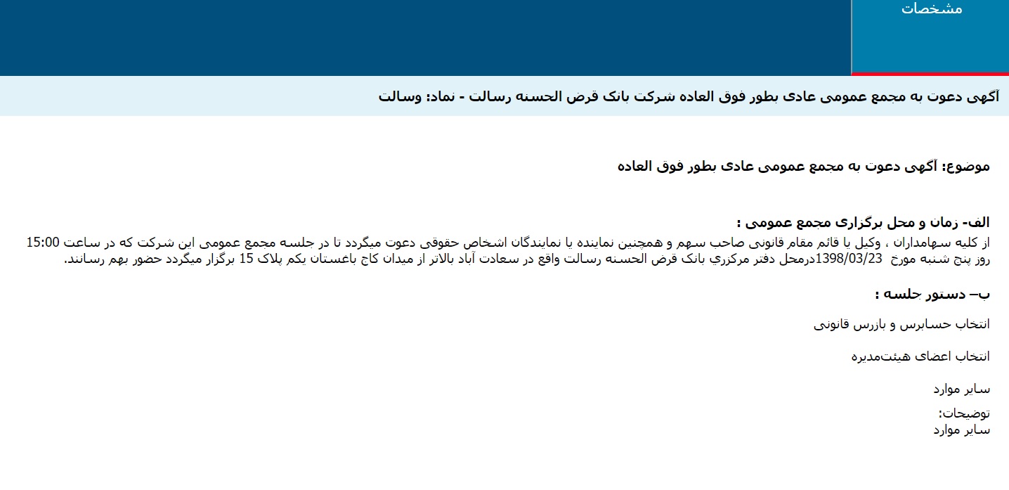 آگهی دعوت به مجمع عمومی عادی بطور فوق العاده شرکت بانک قرض الحسنه رسالت
