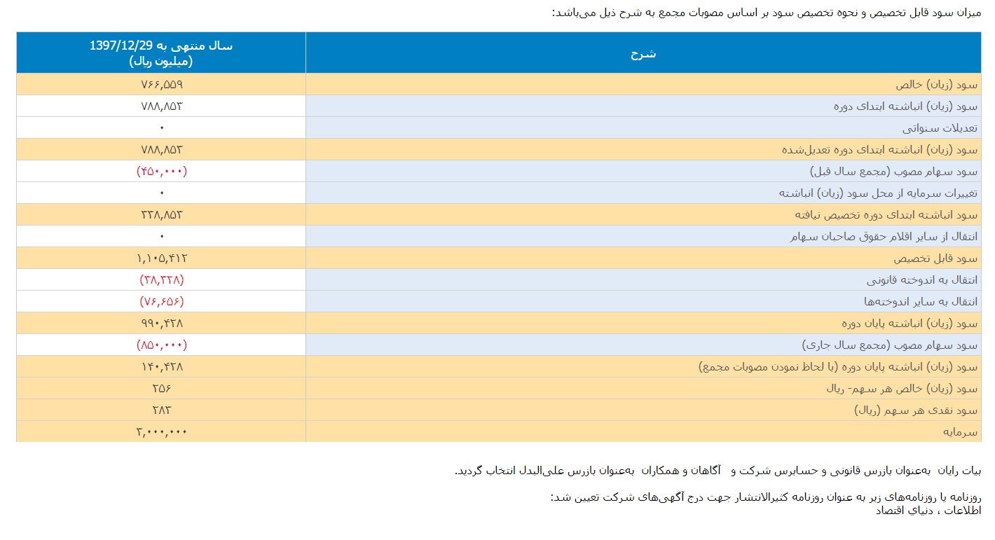 سود خالص این شرکت در دوره مدت اشاره ۷۶۶.۵۵۹ میلیون ریال و سود قابل تخصیص ۱.۱۰۵.۴۱۲ میلیون ریال اعلام شده است. براین اساس سود خالص هر سهم ۲۵۶ ریال و سود نقدی هر سهم نیز ۲۸۳ ریال تعیین شده است.