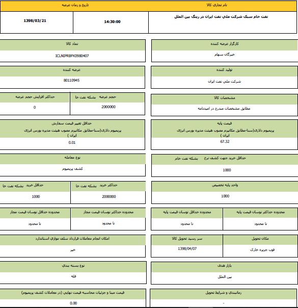 به گزارش ایبِنا، اطلاعیه عرضه دو میلیون بشکه نفت خام سبک شرکت ملی نفت ایران در رینگ بین الملل بورس انرژی با قیمت پایه ۶۷ دلار و ۳۲ سنت برای هر بشکه منتشر شد. این سومین عرضه نفت خام سبک در رینگ بین الملل بورس انرژی در سال ۹۸ است.