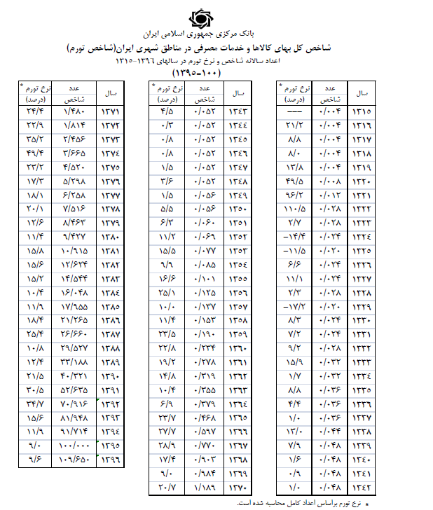 شاخص بهای کالاها و خدمات مصرفی در سال های ۱۳۱۵ تا ۱۳۹۶ دارای تغییرات متفاوتی بوده که در جدول ذیل درج شده است.