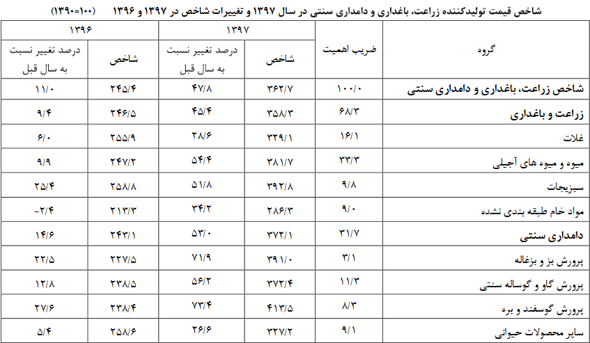 به گزارش ایبِنا براساس اعلام مرکز آمار، شاخص قیمت تولیدکننده زراعت، باغداری و دامداری سنتی (برمبنای ١٠٠=١٣٩٠) در سال ١٣٩٧ برابر است با ٣٦٢,٧ که نسبت به سال قبل (نرخ تورم سالانه) ٤٧.٨ درصد افزایش یافته است.