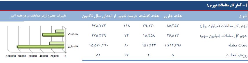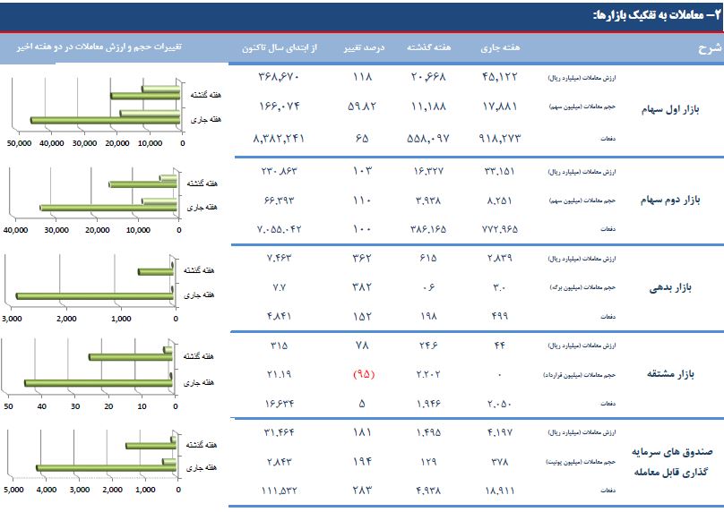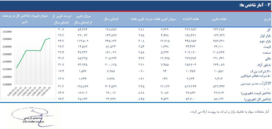 بر اساس این گزارش، شاخص بازار اول با ۴.۴۶۸ واحد افزایش به رقم ۱۷۲.۹۳۹ واحد و شاخص بازار دوم با ۱۳.۷۱۵ واحد افزایش به ۴۵۹.۶۷۱ واحد رسید و به این ترتیب شاخص بازار اول ۲.۶۵ و شاخص بازار دوم با ۳.۰۸ درصد افزایش نسبت به هفته قبل همراه شدند.