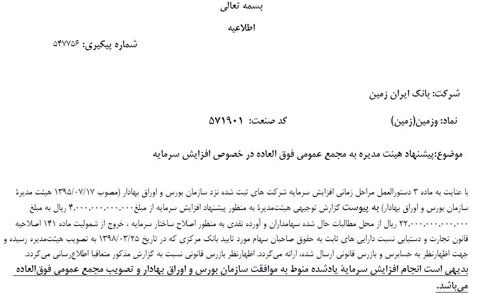 اطلاعیه افزایش سرمایه بانک ایران زمین