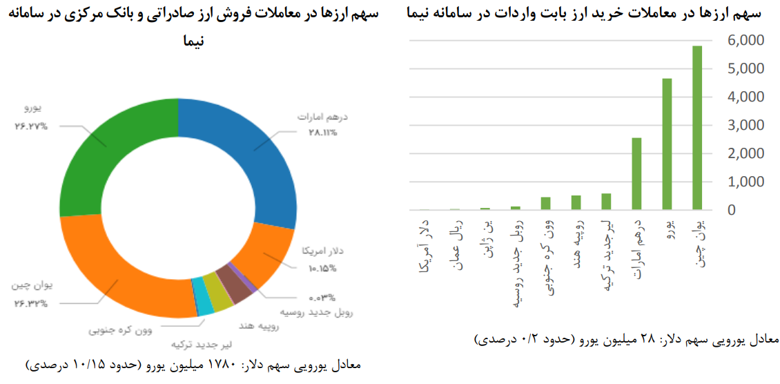 همچنین بررسی سهم ارزها در معاملات فروش ارز صادراتی و بانک مرکزی در سامانه نیما نشان می‌دهد که بیشترین ارز عرضه شده در این سامانه درهم امارات با سهم ۲۸.۱۱ درصدی بوده است. یوان چین دومین ارز پُرفروش در این سامانه است که سهم ۲۶.۳۲ درصدی را به خود اختصاص داده است. یورو نیز سهمی معادل ۲۶.۲۷ درصد از فروش ارز در سامانه نیما داشته و سومین ارز از نظر عرضه در این سامانه به شمار می‌رود.
