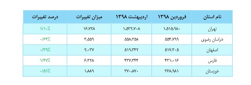 تصویر بالا پنج استان دارای بیشترین تعداد دستگاه کارتخوان فعال را نشان میدهد که بر اساس آن استان تهران در فروردین ماه ۹۸ دارای یک میلیون و ۵۱۵ هزار و ۹۸۰ دستگاه کارتخوان فعال بوده که با رشد تعداد حدود ۱۶ هزار دستگاه، تعداد کارتخوانهای فعال در تهران در اردیبهشت ماه ۱۳۹۸ به ۱ میلیون و ۵۳۲ هزار دستگاه در استان تهران رسیده و باعث شده تا همچنان تهران با برخورداری از بیشترین تعداد دستگاه در صدر جدول استانهای صاحب بیشترین کارتخوان فعال قرار گیرد؛ در ادامه این لیست، استانهای خراسان رضوی، اصفهان، فارس، خوزستان به ترتیب در جایگاه دوم تا پنجم قرار گرفتهاند.
