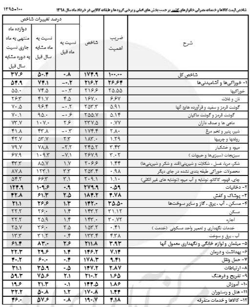 براساس این گزارش، شاخص کل قیمت کالاها و خدمات مصرفی خانوارهای کشور ۱۷۴.۹ درصد گزارش شده که در دوازده ماه منتهی به خرداد نسبت به دوره مشابه سال قبل، ۳۷.۶ درصد و نسبت به ماه مشابه سال قبل ۵۰.۴ درصد تغییر داشته است.