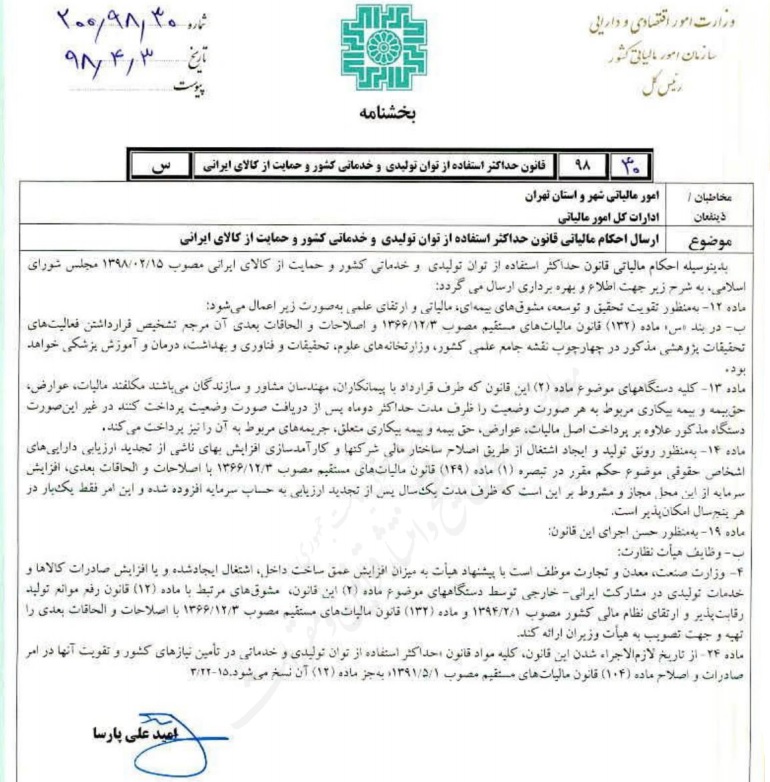 به گزارش خبرنگار ایبِنا، امیدعلی پارسا احکام مالیاتی قانون حداکثر استفاده از توان تولیدی و خدماتی کشور و حمایت از کالای ایرانی مصوب ۱۵ اردیبهشت ماه ۹۸ مجلس شورای اسلامی را ابلاغ کرده است.