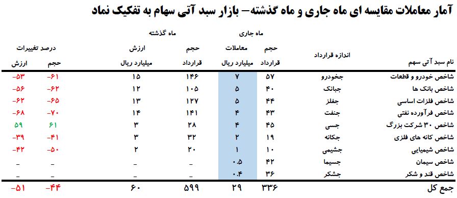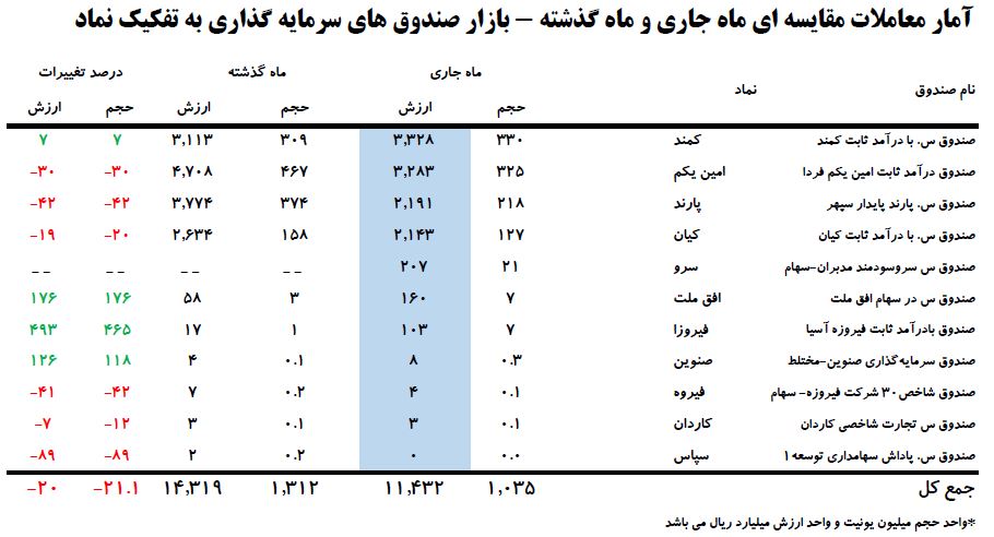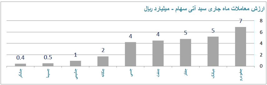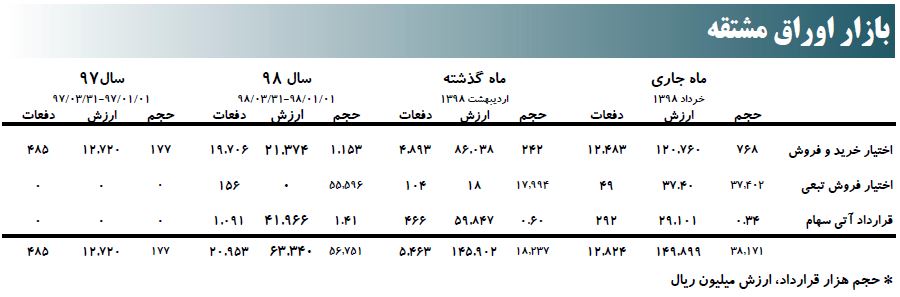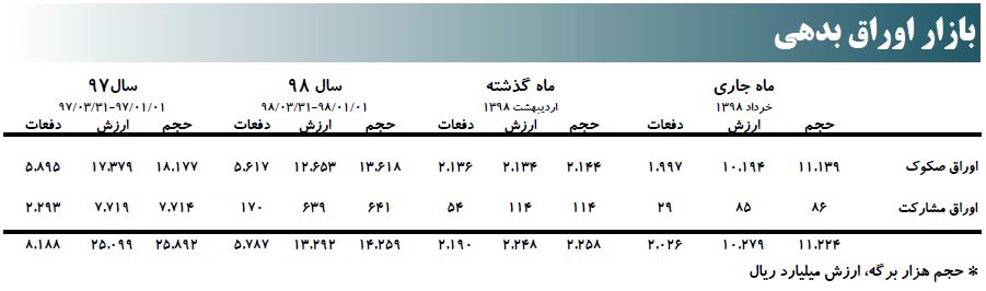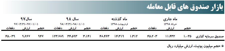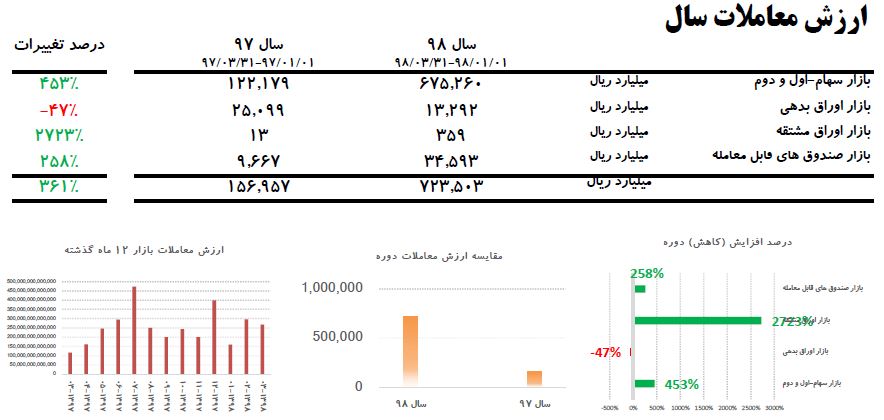 بر اساس این گزارش، طی ۱۸ روز کاری خرداد ماه ۹۸، ارزش معاملات در مقایسه با پایان اردیبهشت ۹۸، معادل ۱۰ درصد کاهش یافت و از ۲۹۶.۱۳۱ میلیارد ریال به ۲۶۷.۴۶۳ میلیارد ریال رسید.