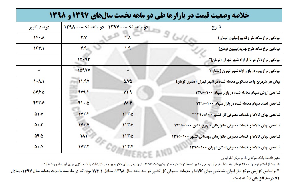 در این گزارش شاخص بهای کالاها و خدمات مصرفی کل کشور (۱۰۰=۱۳۹۵) براساس آمار مرکز آمار ایران در دو ماهه نخست امسال ۱۷۲.۲ درصد اعلام شده که نسبت به رقم ۱۱۳.۵ درصدی افزایشی ۵۱.۷ درصدی داشته است.