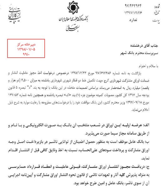به گزارش ایبِنا، براساس مصوبه بورس اوراق بهادار تهران، اوراق مشارکت شهرداری کرج، به مبلغ ۲.۵۰۰ میلیارد ریال، با نرخ سود علی الحساب ۱۸ درصد روز شمار و معاف از مالیات، جهت تامین مالی اجرای فاز یک خط ۲ پروژهی قطار شهری شهرداری کرج، درج شد.