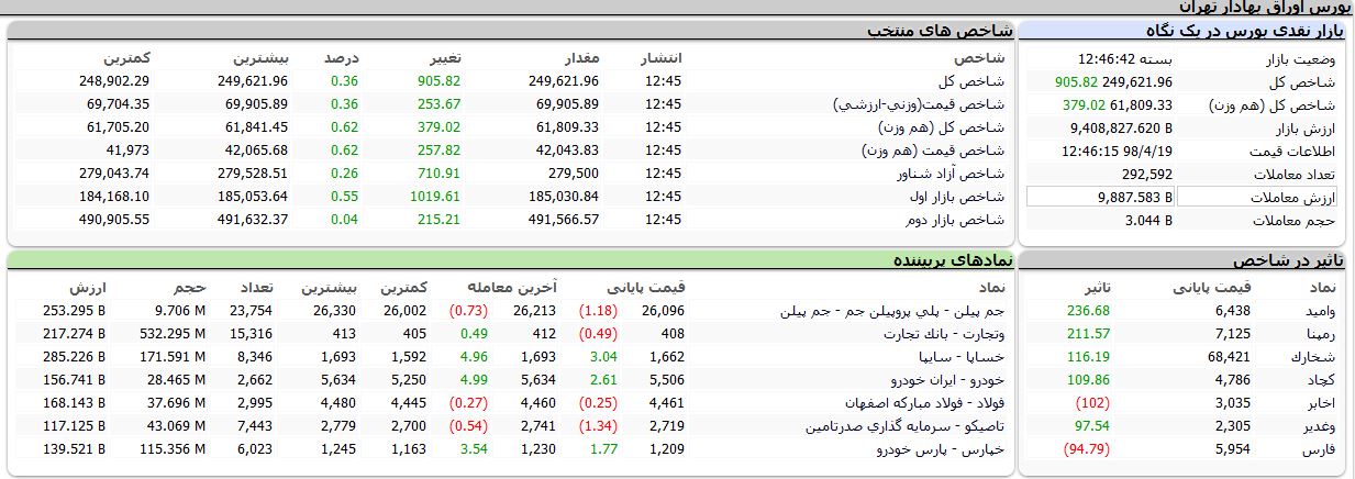 از سویی دیگر امروز ۵ نماد « وامید با ۲۳۶ واحد، رمپنا با ۲۱۱ واحد، شخارک با ۱۱۶ واحد، کچاد با ۱۰۹ واحد، وغدیر با ۹۷ واحد» رشد، بیشترین تاثیر مثبت را بر شاخص کل بورس بر جای گذاشتند.