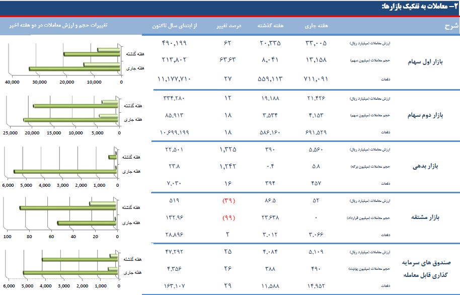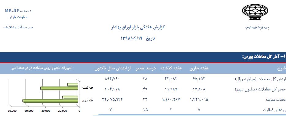 گفتنی است، در ۵ روز کاری هفته گذشته، ارزش کل معاملات اوراق بهادار به ۶۵.۱۵۲ میلیارد ریال بالغ شد که نسبت به هفته قبل ۴۸ درصد افزایش یافت. در ضمن تعداد ۱۷.۸۰۸ میلیون انواع اوراق بهادار در بیش از یک میلیون و ۴۲۱ هزار دفعه مورد معامله قرار گرفت و به ترتیب ۴۹ درصد و ۲۲ درصد افزایش را نسبت به هفته گذشته تجربه کردند.