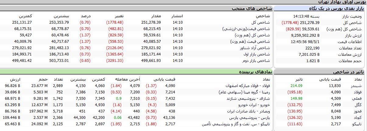 بر اساس آمارهای معاملاتی، روز جاری اکثر شاخص های بورس با ریزش دسته جمعی مواجه شدند به طوری که شاخص کل با (۱۷۷۸) واحد کاهش معادل (۰.۷۰) درصد به ۲۵۱ هزار ۲۷۸ واحد، شاخص قیمت «وزنی - ارزشی» با (۴۸۲) واحد افت معادل (۰.۷۰) درصد به ۶۸ هزار ۲۱۵ واحد، شاخص کل «هم وزن» با (۸۲۹) واحد کاهش معادل (۱.۳۷) درصد به ۵۹ هزار و ۵۳۹ واحد، شاخص قیمت «هم وزن» با (۵۵۸) واحد افزایش، معادل (۱.۳۷) درصد به ۴۰ هزار و ۸۵ واحد، شاخص آزاد شناور با (۲۱۲۶) واحد کاهش، معادل (۰.۷۶) درصد به ۲۷۹ هزار و ۲۱ واحد، شاخص بازار اول با (۱۳۶۵) واحد افت معادل (۰.۷۳) درصد به ۱۸۵ هزار ۱۷۱ واحد و شاخص بازار دوم با (۳۲۹۱) واحد ریزش معادل (۰.۶۵) درصد به ۴۹۹ هزار و ۶۶۱ واحد رسید.