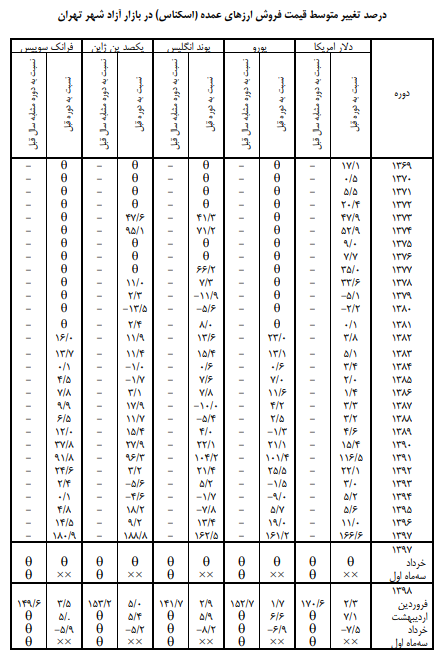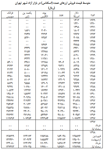 در سه ماه اول سال ١٣٩٨ متوسط قیمت فروش یک دلار آمریکا و یک یورو در بازار آزاد شهر تهران به ترتیب ١٣ هزار و ۸۷۷ تومان و ۱۵ هزار و ۷۵۲ تومان بوده است. متوسط قیمت فروش و درصد تغییر سایر ارزهای عمده در جداول شماره زیر نشان داده شده است.