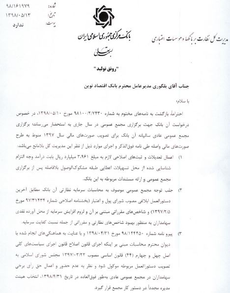 به گزارش خبرنگار ایبِنا، در نامه مدیر کل نظارت بر بانک ها و موسسات اعتباری بانک مرکزی درباره مجوز برگزاری مجمع بانک اقتصاد نوین آمده است : برگزاری مجمع عمومی عادی سالیانه آن بانک برای تصویب صورت های مالی سال ۹۷ منوط به طرح صورتهای مالی واصله و اجرای مواد ذیل از نظر این مدیریت کل بلامانع است.
