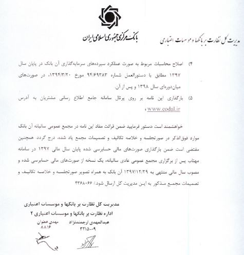 - اصلاح محاسبات مربوط به صورت عملکرد سپرده های سرمایه گذاری آن بانک در پایان سال ۹۷ مطابق با دستورالعمل با دستورالعمل ۲۰ خرداد ۹۴ در صورت های میان دوره ای سال ۹۸ و پس از آن.