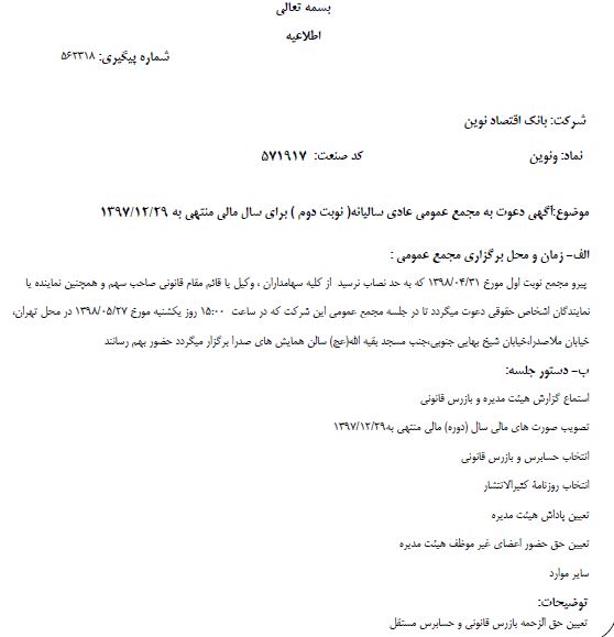 اطلاعیه دعوت به مجمع بانک اقتصاد نوین