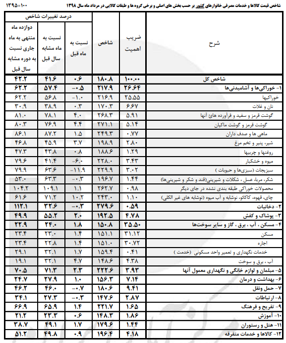 همچنین طبق گزارش تهیه شده شاخص قیمت کالاها در ۱۲ ردیف به تفکیک اعلام شده که بر این اساس، شاخص قیمتی خوراکی‌ها و آشامیدنی‌ها نیز در مردادماه نسبت به ماه مشابه سال قبل ۵۷.۴ درصد و دوازده ماه منتهی به ماه جاری نسبت به دوره مشابه سال قبل ۶۲.۲ درصد رشد داشته است.