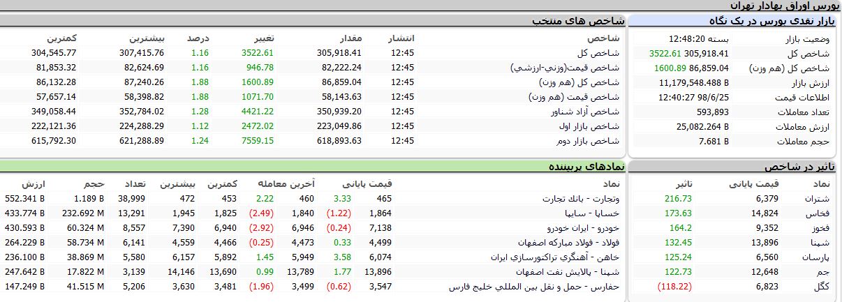 بر اساس آمارهای معاملاتی، روز جاری اکثر شاخصهای بورس با رشد مواجه شدند به طوری که شاخص کل با ۳۵۲۲ واحد رشد معادل ۱.۱۶ درصد به ۳۰۵ هزار و ۹۱۸ واحد، شاخص قیمت «وزنی - ارزشی» با ۹۴۶ واحد افزایش معادل ۱.۱۶ درصد به ۸۲ هزار و ۲۲۲ واحد، شاخص کل «هم وزن» با ۱۶۰۰ واحد رشد معادل ۱.۸۸ درصد به ۸۶ هزار و ۵۸۹ واحد، شاخص قیمت «هم وزن» با ۱۰۷۱ واحد افزایش، معادل ۱.۸۸ درصد به ۵۸ هزار و ۱۴۳ واحد، شاخص آزاد شناور با ۴۴۲۱ واحد رشد، معادل ۱.۲۸ درصد به ۳۵۰ هزار و ۹۳۹ واحد، شاخص بازار اول با ۲۴۷۲ واحد افزایش معادل ۱.۱۲ درصد به ۲۲۳ هزار ۴۹ واحد و شاخص بازار دوم با ۷۵۵۹ واحد رشد معادل ۱.۲۴ درصد، به ۶۱۸ هزار و ۸۹۳ واحد رسید.