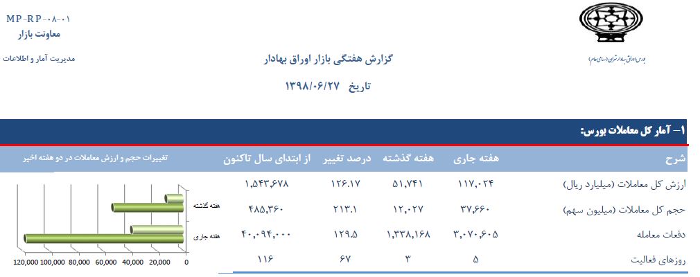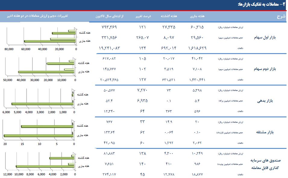 از سویی دیگر، در ۵ روز کاری این هفته، ارزش کل معاملات اوراق بهادار به ۱۱۷۰۲۴ میلیارد ریال بالغ شد که نسبت به هفته قبل ۱۲۶ درصد افزایش یافت. همچنین تعداد ۳۷.۶۶۰ میلیون انواع اوراق بهادار در بیش از ۳ میلیون و ۷۰ هزار دفعه مورد معامله قرار گرفت و به ترتیب ۲۱۳ درصد و ۱۲۹ درصد افزایش را نسبت به هفته گذشته تجربه کردند.