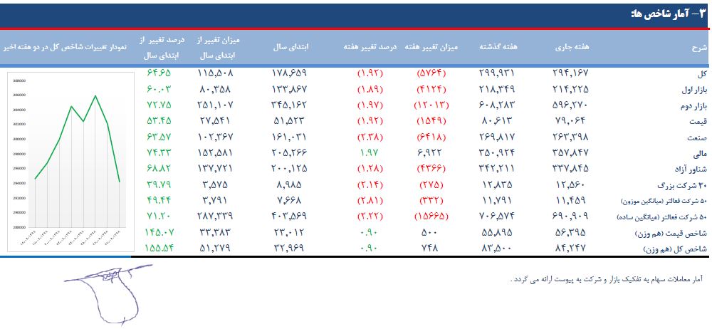 به گزارش ایبِنا، اطلاعات منتشر شده از داد و ستدهای تالار شیشه ای حاکی از آن است که در پایان معاملات هفته منتهی به ۲۷ شهریورماه ۹۸، شاخص کل با (۵.۷۶۴) واحد کاهش معادل (۱.۹۲) درصد به ۲۹۴.۱۶۷ واحد رسید. بر اساس این گزارش، شاخص کل هم وزن با ۷۴۸ واحد افزایش معادل ۰.۹۰ درصد به رقم ۸۴.۲۴۷ واحد را به نمایش گذاشت.