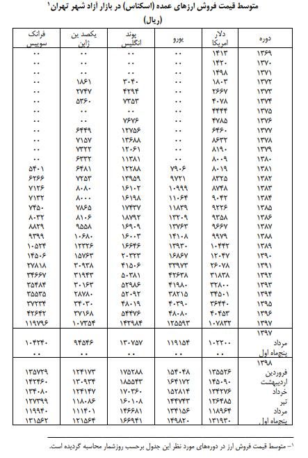 در پنج ماه اول سال ١٣٩٨ متوسط قیمت فروش یک دلار آمریکا و یک یورو در بازار آزاد شهر تهران به ترتیب ١٣ هزار و ۱۹۳ تومان و ۱۴ هزار و ۹۸۲ تومان بوده است. متوسط قیمت فروش و درصد تغییر سایر ارزهای عمده در جداول زیر نشان داده شده است.