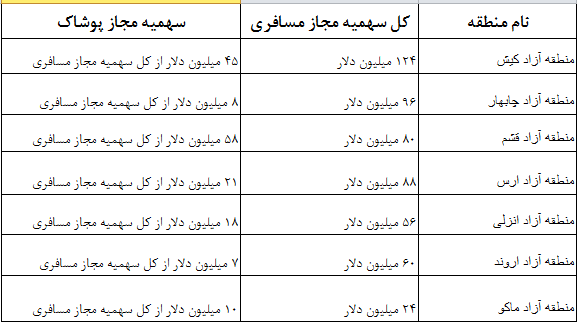 برای اسن منظور بازرگانان مناطق آزاد باید در مرحله اول ثبت پرونده در قسمت نوع کالای وارداتی، گزینه "همراه مسافر" را انتخاب نمایند. کد تعرفه‌ها و همچنین سقف سهمیه مجاز مسافری هر منطقه و سقف سهمیه مجاز مسافری برای واردات پوشاک هر منطقه، در جدول زیر آمده است.
