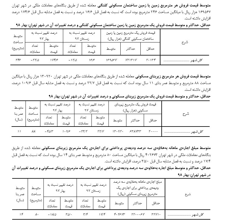 به گزارش ایبِنا، براساس آخرین بررسیها افزایش ١٧٤.٦ درصدی قیمت فروش یک مترمربع زمین یا زمین ساختمان مسکونی کلنگی، افزایش١٠٩.٦ درصدی قیمت فروش یک مترمربع زیربنای مسکونی و افزایش٣٥.٠ درصدی متوسط مبلغ اجاره به علاوه سه درصد ودیعهی پرداختی برای اجاره یک مترمربع زیربنای مسکونی در بهار ٩٨ نسبت به بهار ٩٧ در شهر تهران به دست آمده است.