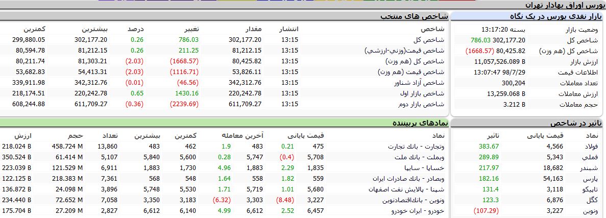 بر اساس آمارهای معاملاتی، روز جاری اکثر شاخصهای بورس با رشد مواجه شدند به طوری که شاخص کل با ۷۸۶ واحد رشد معادل ۰.۲۶ درصد به ۳۰۲ هزار و ۱۷۷ واحد، شاخص قیمت «وزنی - ارزشی» با ۲۱۱ واحد افزایش معادل ۰.۲۶ درصد به ۸۱ هزار و ۲۱۲ واحد، شاخص کل «هم وزن» با (۱۶۶۸) واحد افت معادل (۲.۰۳) درصد به ۸۰ هزار و ۴۲۵ واحد، شاخص قیمت «هم وزن» با (۱۱۱۶) واحد افت، معادل (۲.۰۳) درصد به ۵۳ هزار و ۸۲۶ واحد، شاخص آزاد شناور با (۴۶) واحد کاهش، معادل (۰.۰۱) درصد به ۳۴۲ هزار و ۳۱۲ واحد، شاخص بازار اول با ۱۴۳۰ واحد صعود معادل ۰.۶۵ درصد به ۲۲۰ هزار ۲۴۲ واحد و شاخص بازار دوم با (۲۲۳۹) واحد کاهش معادل (۰.۳۶) درصد، به ۶۱۱ هزار و ۷۰۹ واحد رسید.