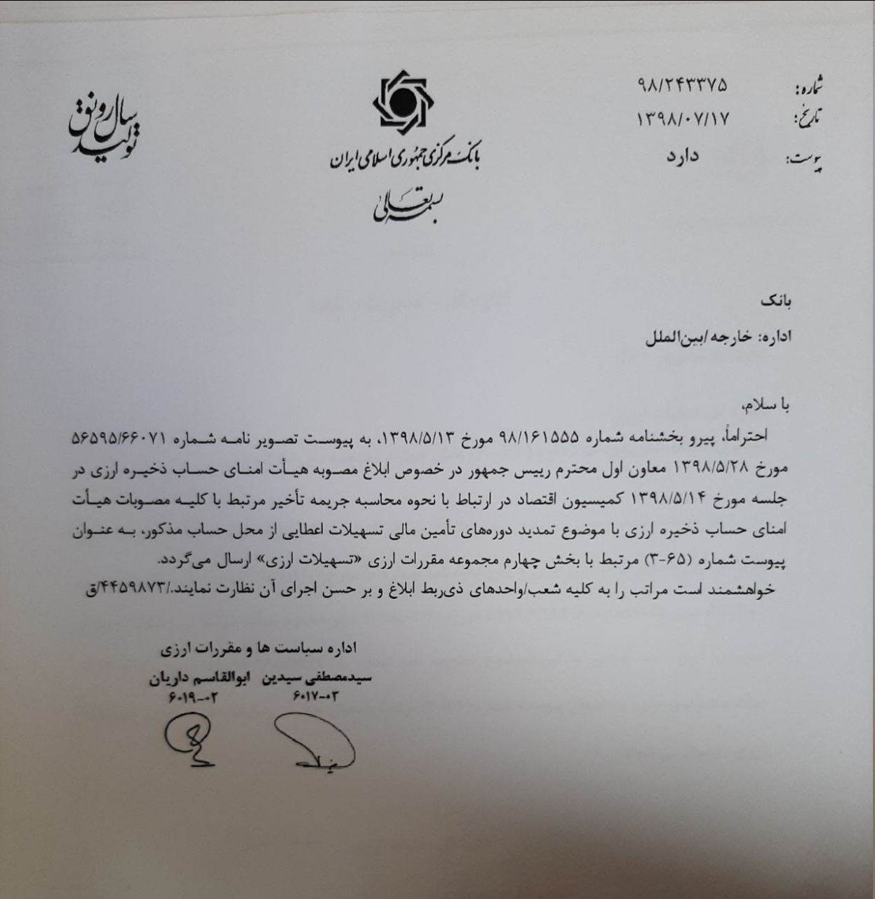 به گزارش خبرنگار ایبِنا، بانک مرکزی در بخشنامهای مصوبه هیات امنای حساب ذخیره ارزی را در ارتباط با نحوه محاسبه جریمه تاخیر مرتبط با کلیه مصوبات هیات امنای حساب ذخیره ارزی با موضوع تمدید دورههای تامین مالی تسهیلات اعطایی از محل حساب مذکور ابلاغ کرد.